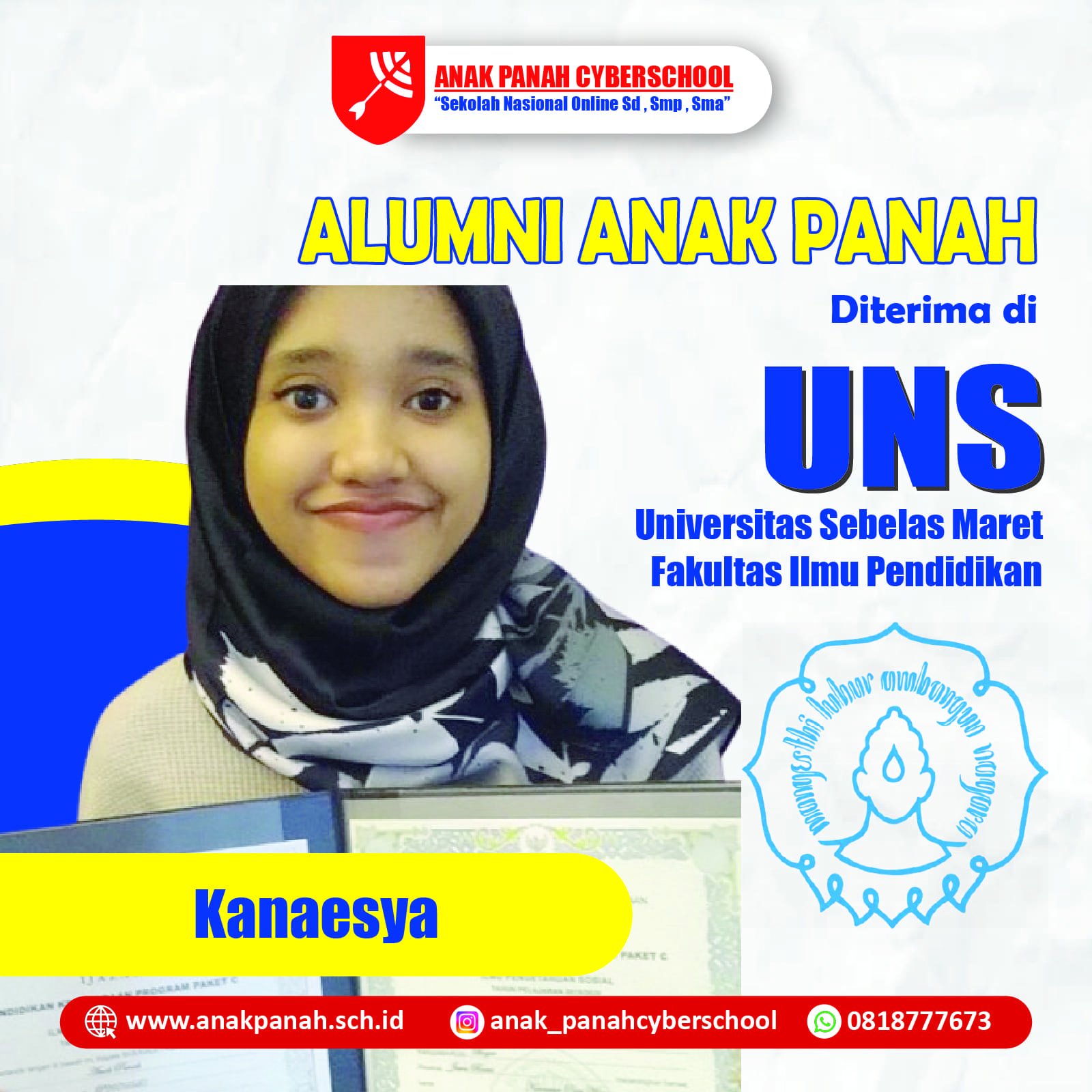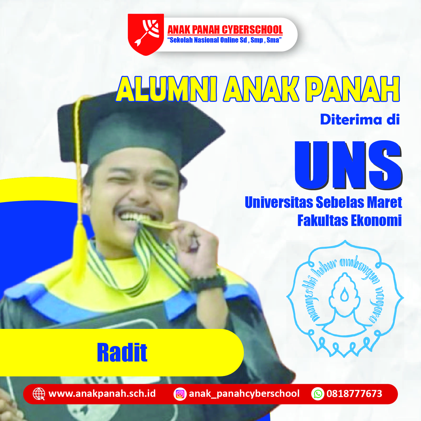 "Dukungan Anak Panah Cyberschool sangat membantu saya masuk UNS. Terima kasih banyak!"